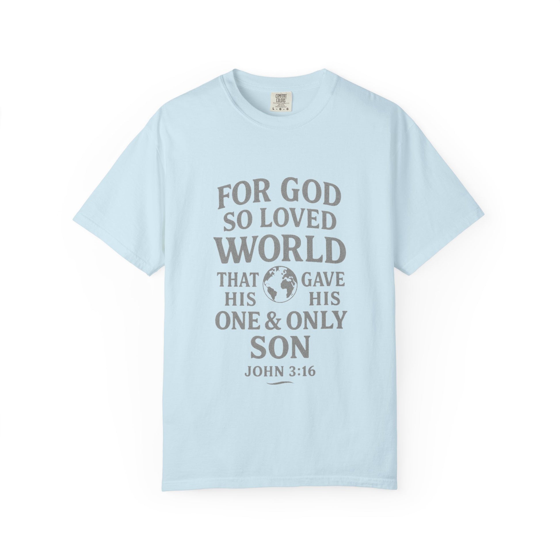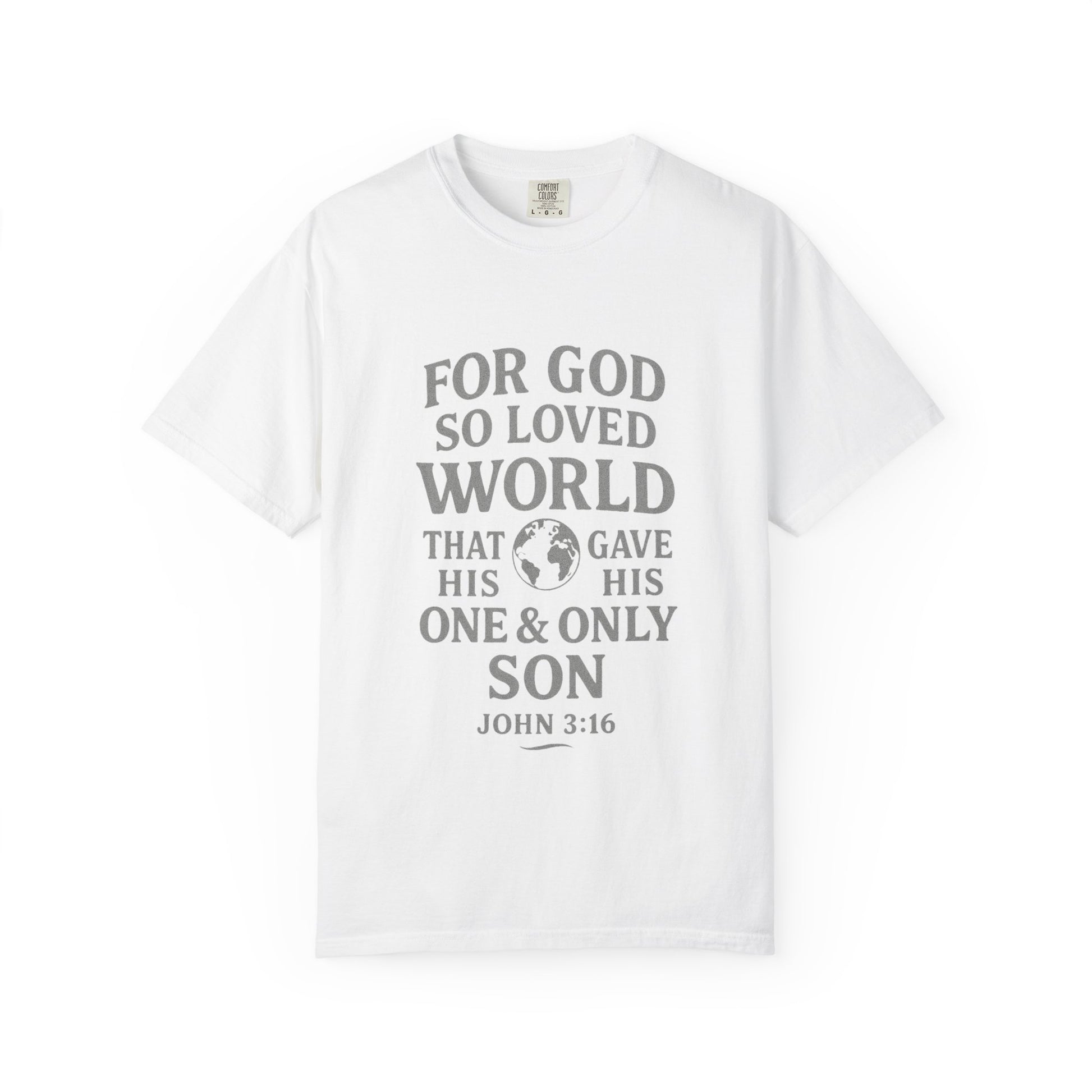 A soft, garment-dyed cotton tee that speaks gently and plainly about faith. The shirt features a muted, centered scripture design—John 3:16—arranged with a small globe graphic that keeps the message hopeful rather than flashy. The relaxed, midweight fabric has a lived-in feel straight out of the box and wears well under a jacket or on its own for everyday ministry, volunteer work, church gatherings, or quiet Sundays. It’s made with durable double-needle stitching and a tubular knit that keeps the silhouette clean. This is a wearable reminder of grace that moves easily from service to coffee shop conversations.